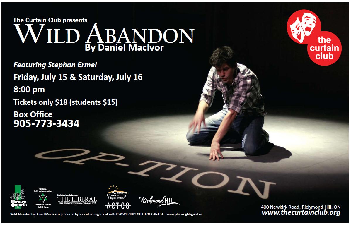 The Curtain Club is pleased to announce a special summer production for two nights only! On July 15 and July 16 only, The Curtain Club will present the Canadian play Wild Abandon by Daniel MacIvor.